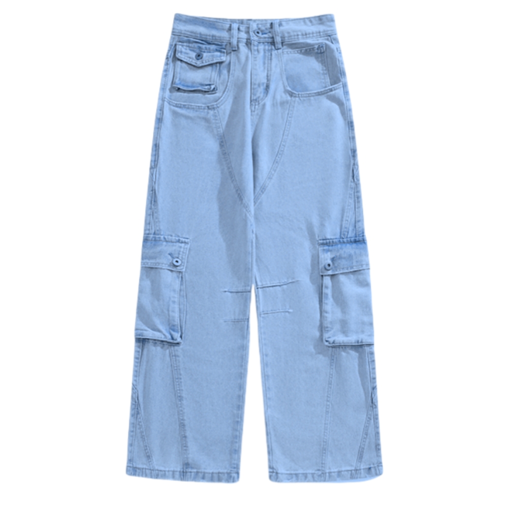 - Utility Patchwork Cargo Denim Pants – Functional Pocket Washed Dance Floor-Length Trousers